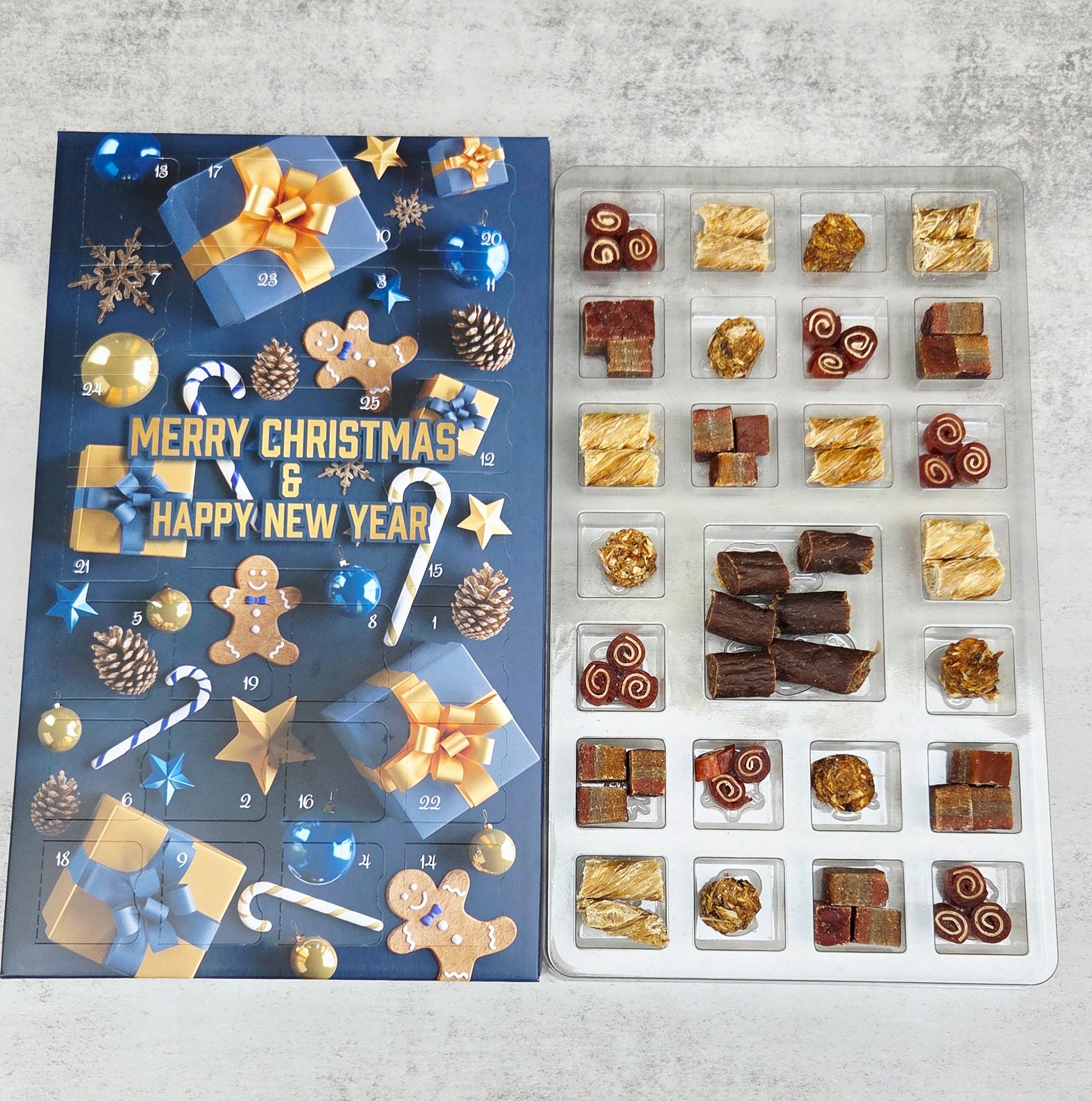 Our meaty treat advent calendar contains the following delicious tasty treats: